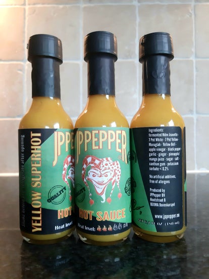 Inhoud 180 ml. Yellow superhot is gemaakt van gefermenteerde Madame Jeanette aangevuld met extra hete gele pepers. De smaak is fruitig en past uitstekend bij gerechten uit de Surinaamse keuken. Qua hitte heeft deze 3 van de 5 vlammetjes, maar vergis je niet, hij is nog steeds een stuk heter dan de gemiddelde hete saus.